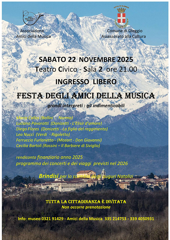 Sabato 22 novembre si è tenuta presso l’Auditorium del Teatro Civico la serata programmata per lo svolgimento dell’Assemblea dei Soci che prevedeva le delibere relative al Rendiconto finanziario 2025, il rinnovo del Consiglio Direttivo e notizie e commenti sull’andamento dei concerti dell’anno che sta per chiudersi e le prime anticipazioni del programma 2026. Nonostante la serata davvero gelida e diverse disdette giunte man mano per “influenza” erano presenti alcune decine di spettatori, tra i quali non pochi venuti da Città limitrofe. Quest’anno la serata dell’Assemblea ha riproposto il titolo “La Festa degli Amici della Musica” che già indicava un contenuto molto indirizzato verso il piacere di ritrovarsi insieme, naturalmente nel pieno rispetto delle norme statutarie. Novità assoluta per questa serata era la presentazione di sei inserti con funzione di prologo musicale, tutti e sei con brevi ma famosissimi brani di opere liriche nell’interpretazione dei grandi nomi del melodramma degli ultimi anni: In tal modo, con sintetiche note di guida all’ascolto, è stato possibile riascoltare Ferruccio Furlanetto (Don Giovanni), Cecilia Bartoli (Il Barbiere di Siviglia), Luciano Pavarotti (L’Elisir d’amore) , Leo Nucci (Rigoletto), Diego Flores (La figlia del reggimento) e naturalmente Maria Callas (Norma – Casta Diva) che, come scoperto da uno studioso di Catania, Bellini aveva scritto mentre era a Oleggio, presso villa Trolliet, dopo essersi temporaneamente trasferito da Milano per timore della peste. Il rendiconto finanziario e il rinnovo triennale - dal 2026 al 2028 - del Consiglio Direttivo sono stati approvati e più tardi confermati con Luigi Crippa Presidente, Cristina Leonardi e Ezio Vandone Vicepresidenti. Sono anche stati anticipati alcuni concerti programmati per il prossimo anno, con le novità, tra gli altri, di una serata con pianoforte a quattro mani, un’altra serata con un baritono protagonista e il ritorno ad un concerto presso la magnifica Chiesa di Santa Maria Annunciata di un quintetto di trombe e organo. La “Festa” è poi proseguita con un “brindisi” per lo scambio degli auguri Natalizi e così gli Amici della Musica arriveranno al sessantesimo anno di vita . In apertura della riunione era stato commemorato Franco Sonzini, da non molto scomparso, che era stato Socio fondatore (nel 1966) e poi Presidente e per tanti anni membro del Consiglio Direttivo dell’associazione.